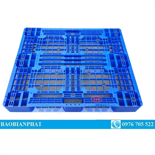 - Mặt ngoài của pallet được thiết kế với nhiều đường gân tăng cứng chịu lực. Tạo cho pallet độ cũng vững cần thiết. Bên cạnh đó việc bố trí lên đến 20 nú chống trượt giúp cho hàng hóa khi được sắp lên pallet đảm bảo độ đứng vững không bị di chuyển trượt..